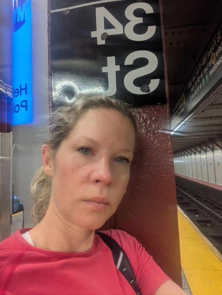 I hung around a bit. I took a selfie, which did not look like Marilyn Monroe. Everyone in the office kept saying the subway was dangerous, and obviously at that time of day on a bank holiday, it was not exactly teeming with people, but they all seemed to be normal people going to their jobs, and the guy muttering at a wall was easy enough to avoid.