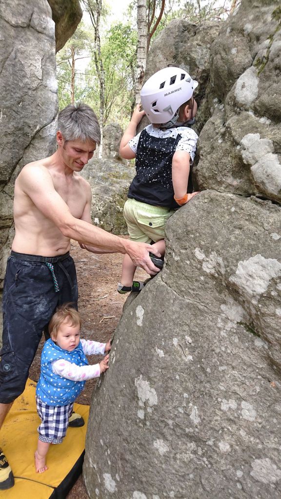I never really know why anyone climbs anything. It’s a pleasing movement and sometimes attains views and routes that are inaccessible without ropes and other protection. That is my main goal with climbing, getting somewhere I couldn’t otherwise. I can’t reach little rock summits in the Alps without a rope, or the amazing finish of the Arête des Cosmiques on the viewing platform. I do also enjoy bouldering in Fontainebleau, even though I’ve not been for many years, because it’s relaxing and sociable, and there are so many routes you can always find whatever you feel like doing that day. I have so many happy memories of those days, even though they seem far away now. There is endless cuteness and fun involved in climbing days out with kids, as well as the long-gone days when we went to the Alps as a new partnership.
